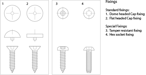 As standard we can supply fixings with either a dome or flat headed cap screw. We also offer the option of upgrading to security Resistorx fixings (where greater security is required) or dome headed hex socket fixings.